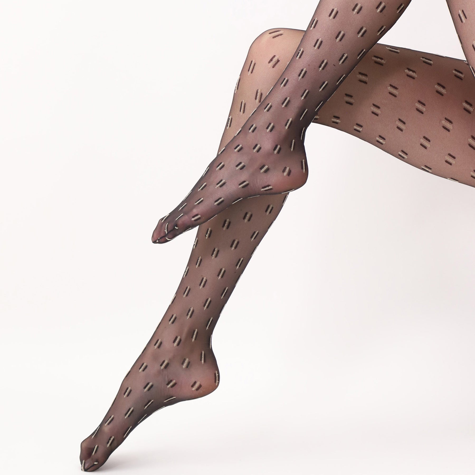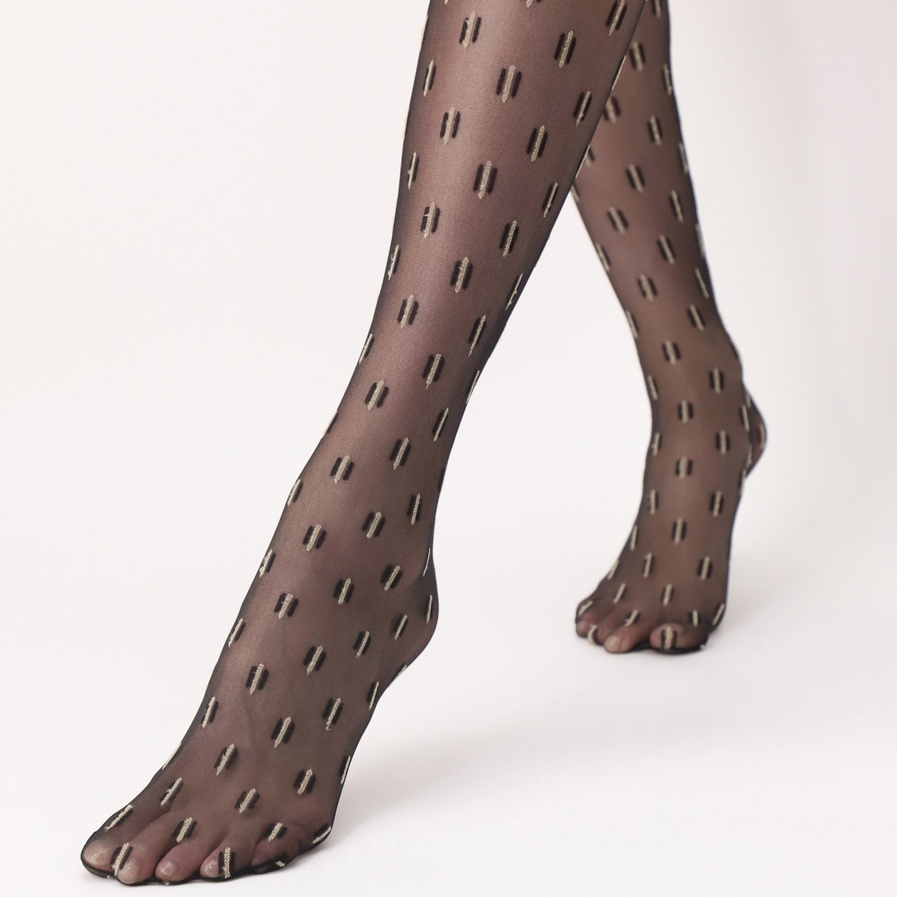 Dessa skira strumpbyxor i 20 den är utsmyckade med ett delikat grafiskt mönster med svarta och beiga stavar som. Det bekväma midjebandet säkerställer en perfekt passform, så att du kan röra dig fritt hela dagen. De platta sömmarna ger också extra komfort.